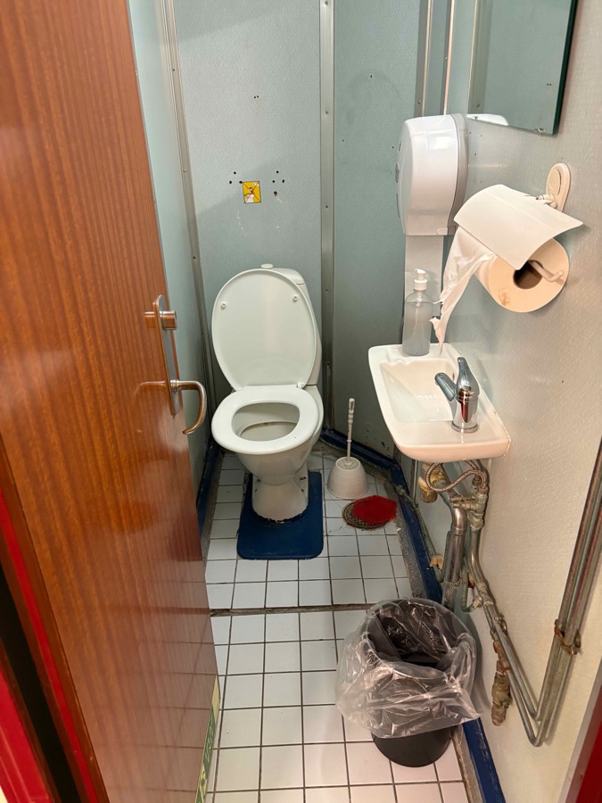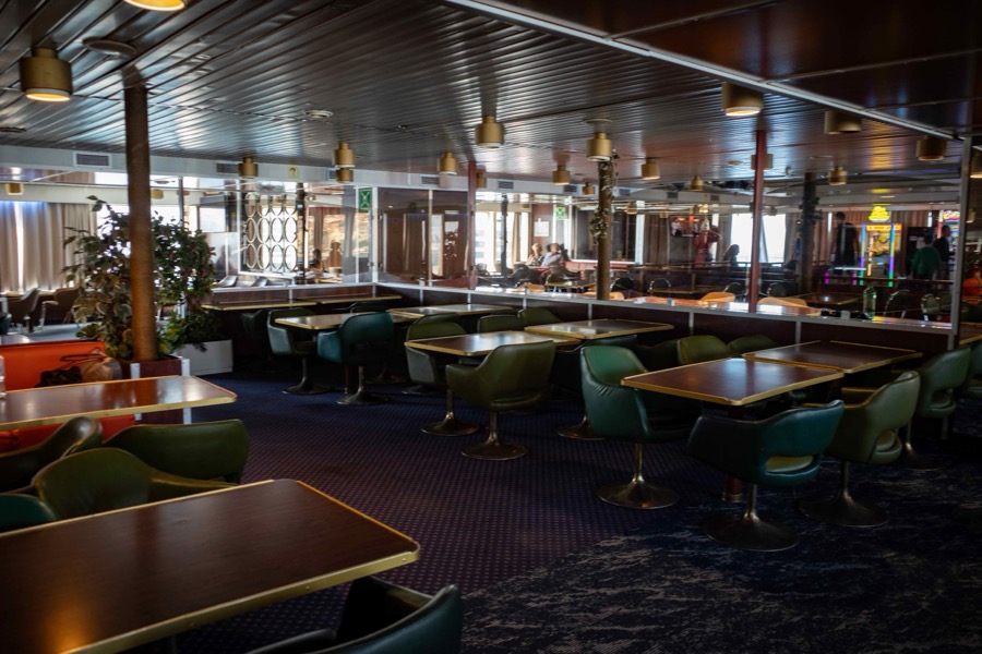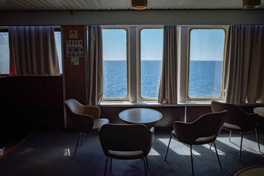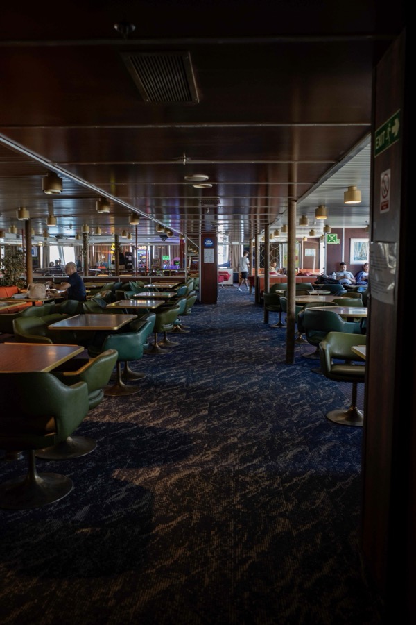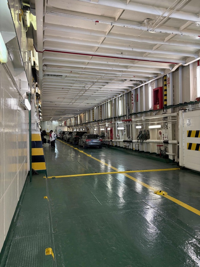 With a full breakfast, we boarded the boat on time–alongside a queue of cars: